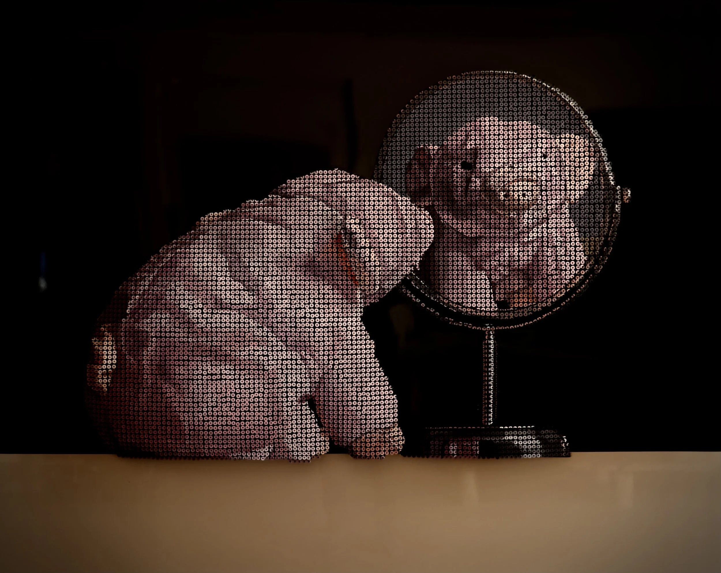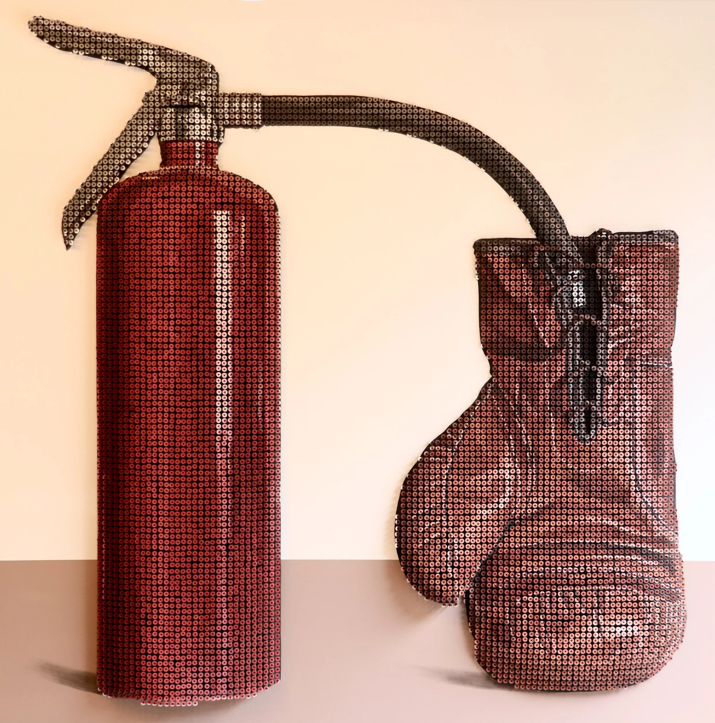 Thousands of screws create a sculptural relief of a shirt and tie. Each screw is hand painted with oil paint to create the image.