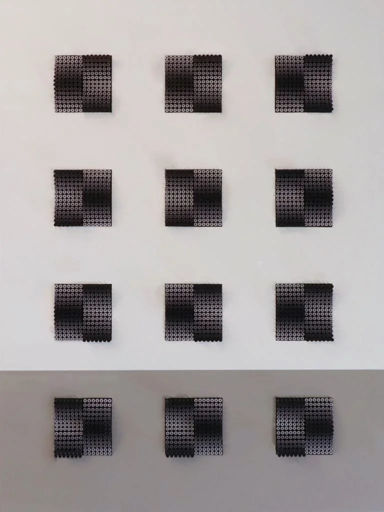 “Moments in Color” is a series, where Andrew got to play around with color combinations and patterned shapes. Andrew immensely enjoys the subtleties that color provides as an emotion and a feeling. He used two background colors, and then a gradient complimentary color on the screws. The squares are made out of screws that make patterns and shapes, so there’s a movement from high to low and from side to side.