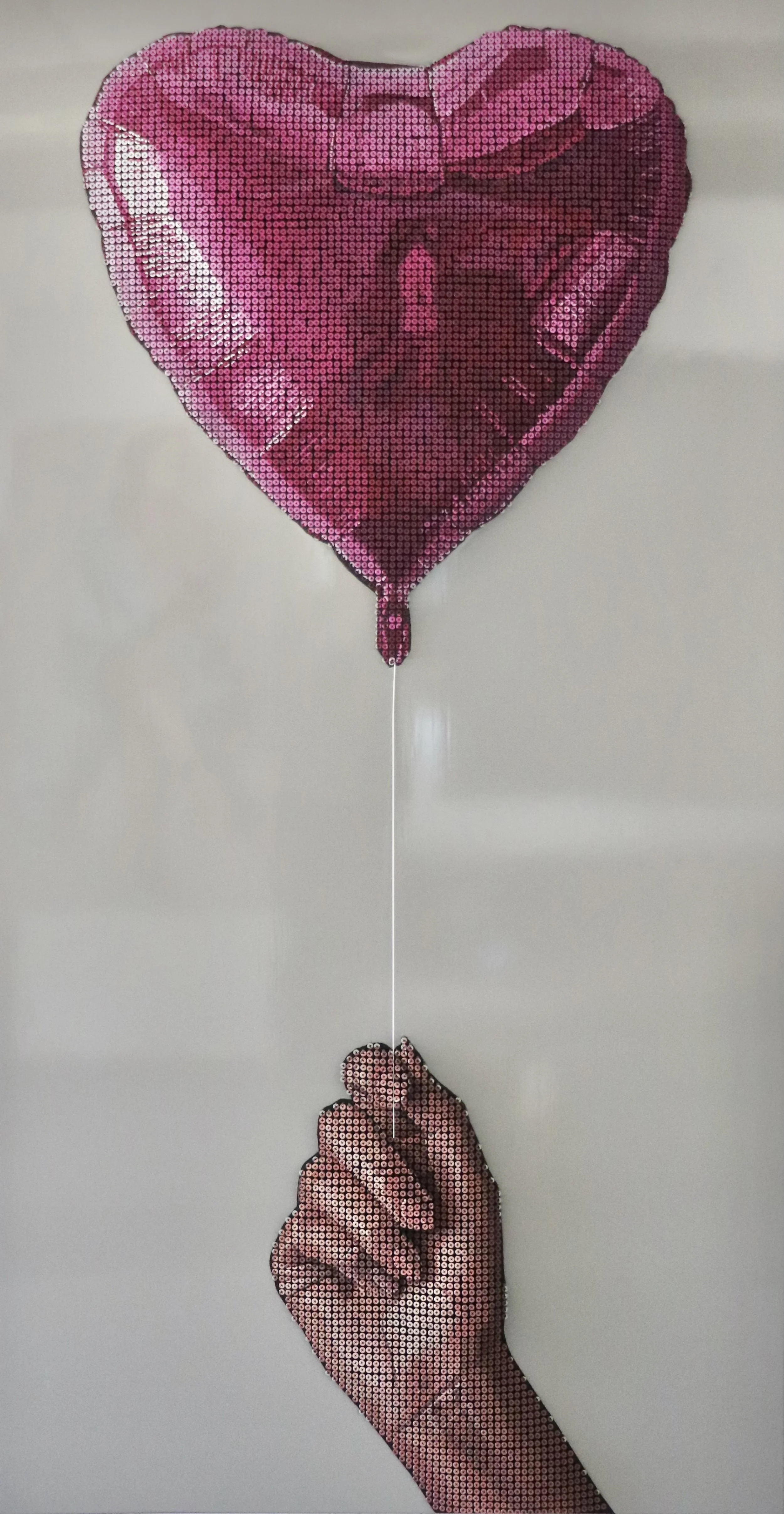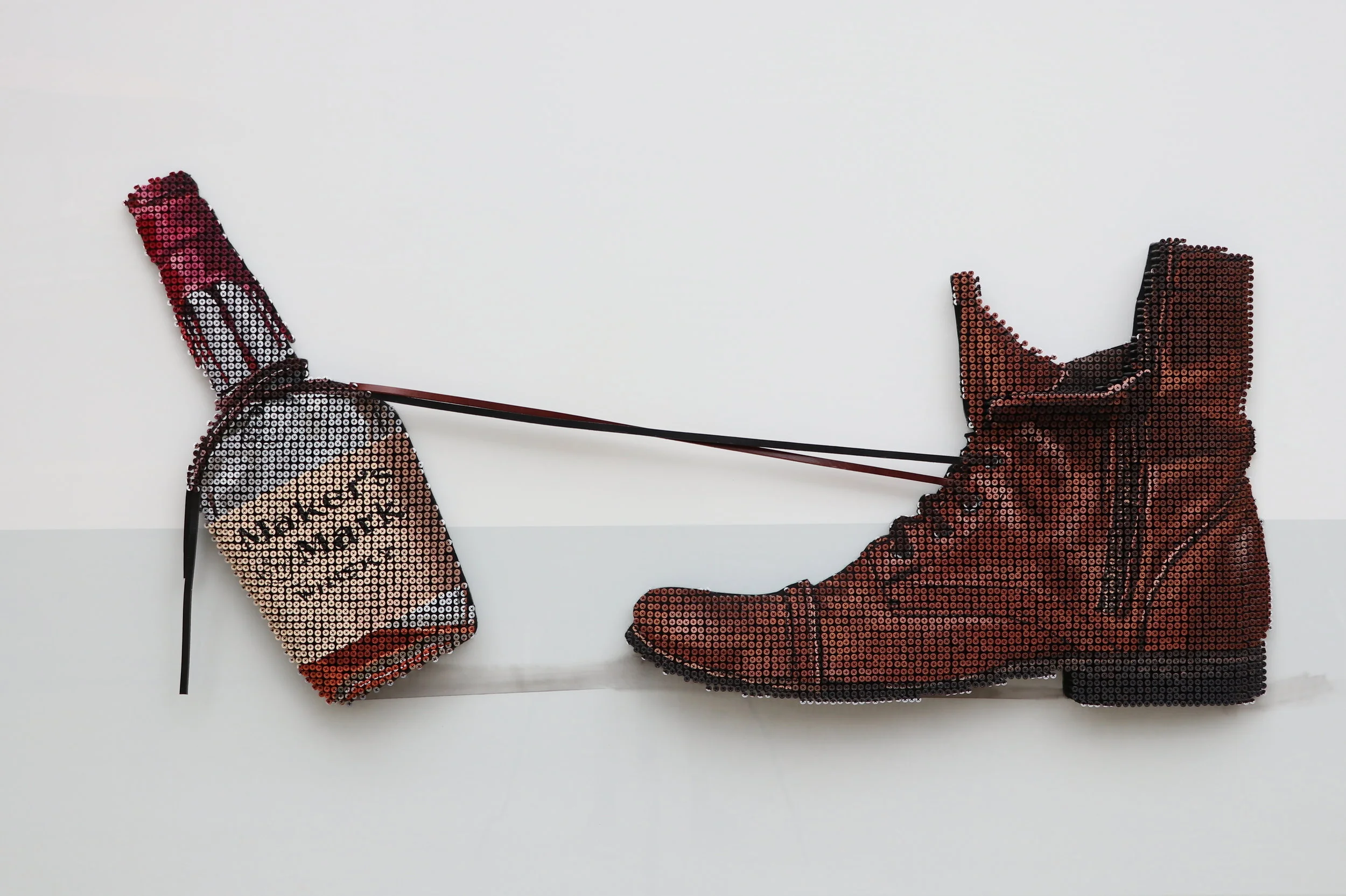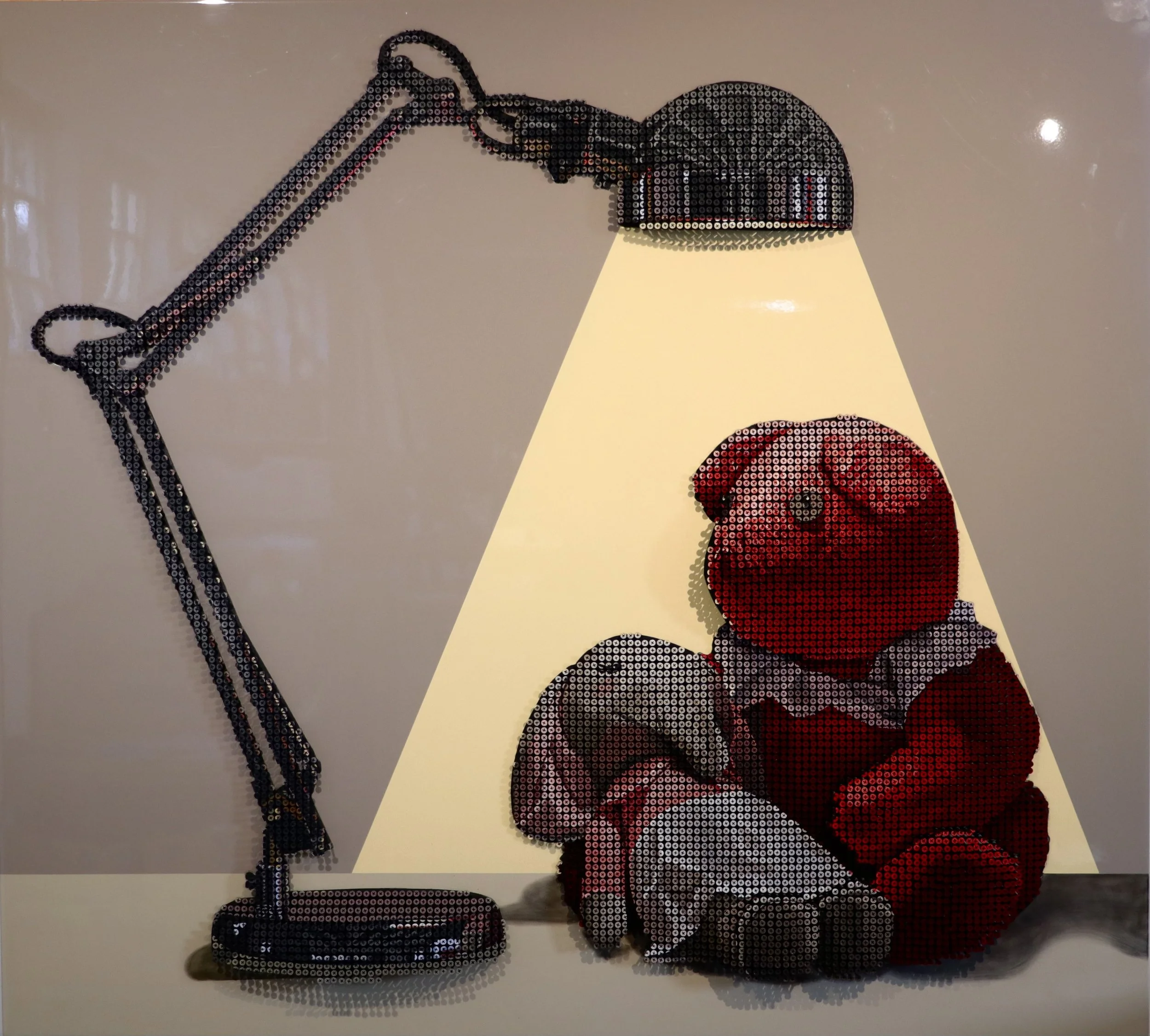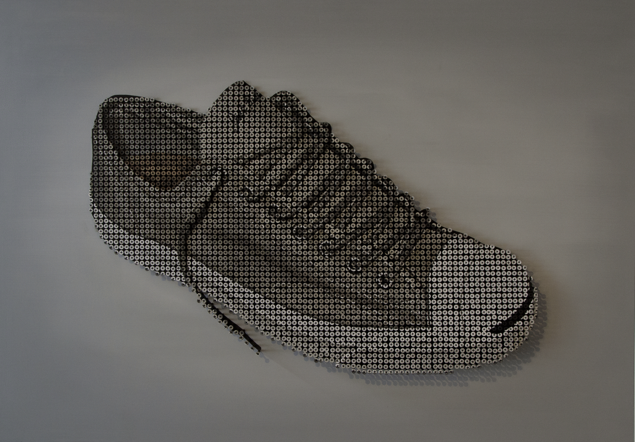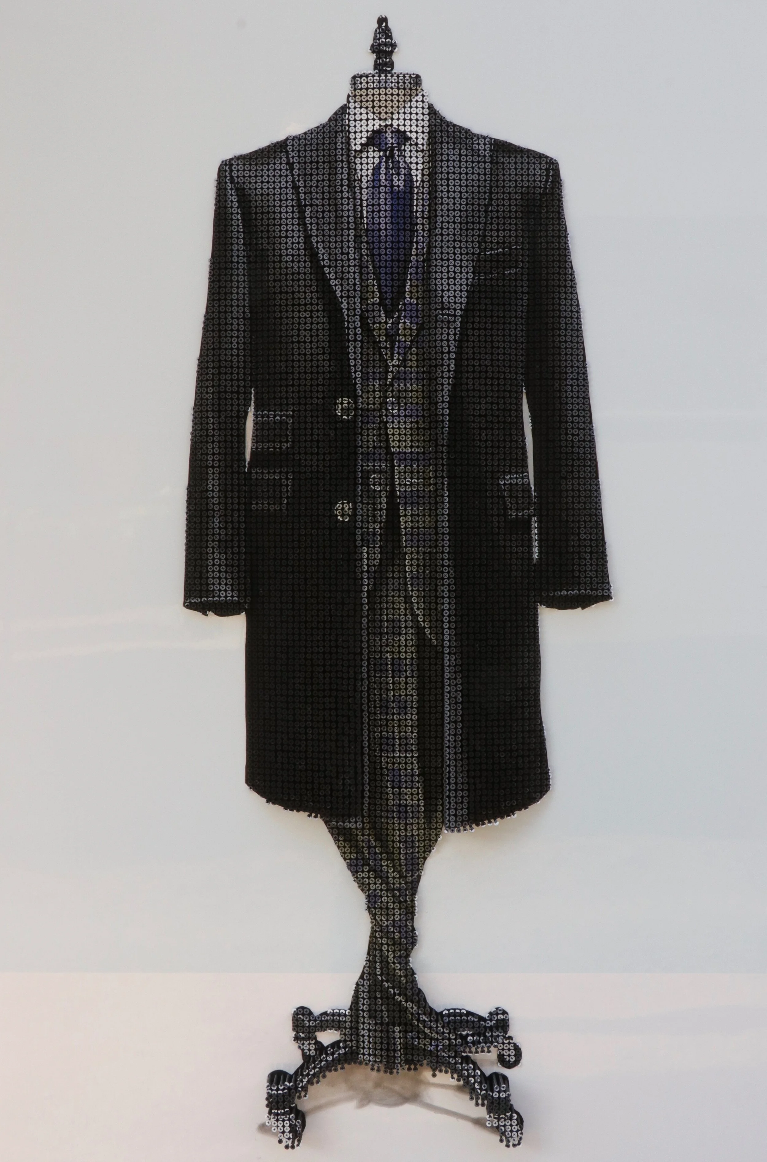 Thousands of screws create a sculptural relief of a shirt and tie; each screw is hand painted with oil paint to create the image.