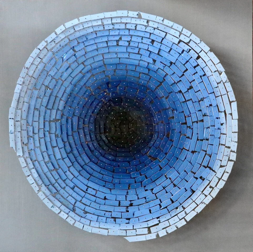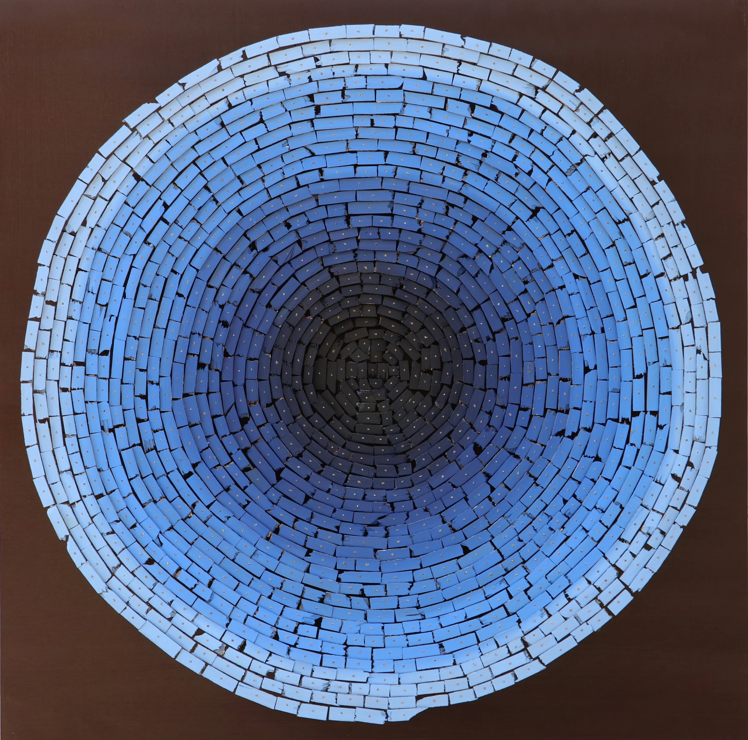 over 7,000 screws, oil paint, acrylic polyurethane enamel background, wood panel