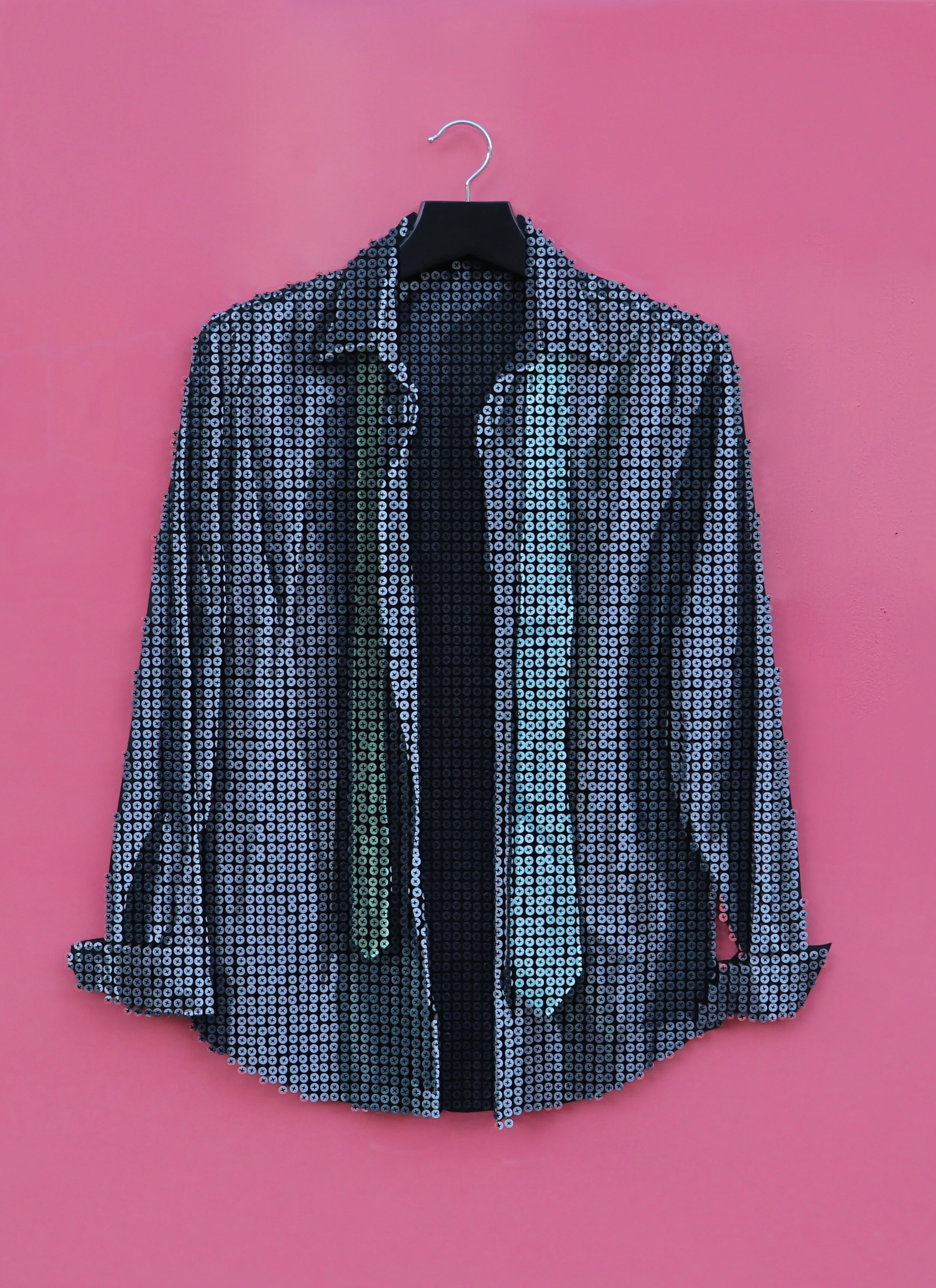 Thousands of screws create a sculptural relief of a shirt and a tie. Each screw is hand painted with oil paint to create the image.