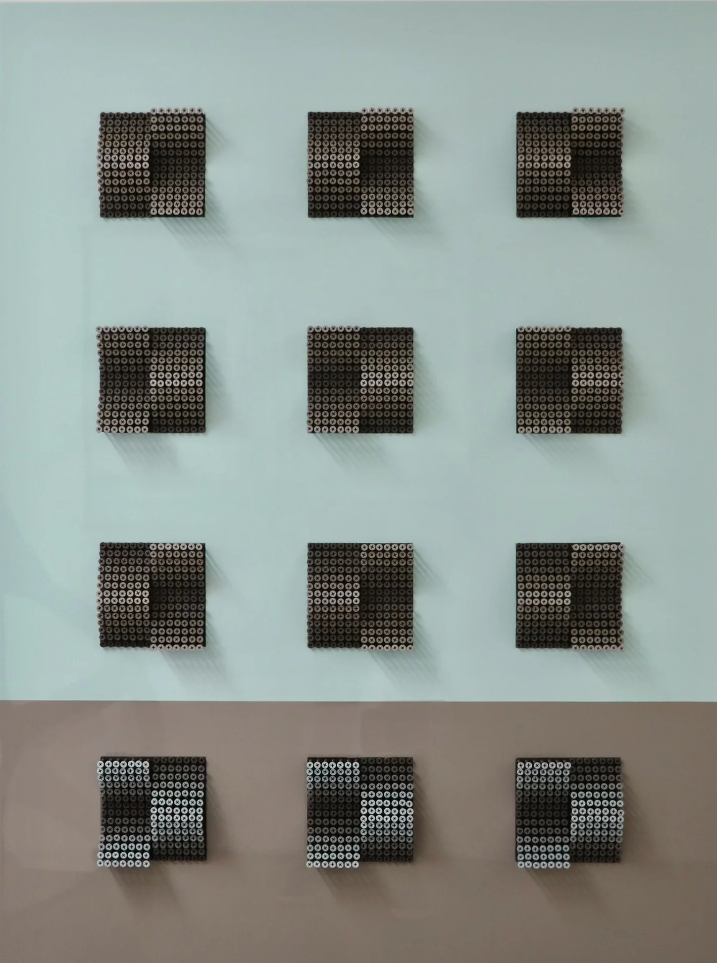 These pieces are designed to trick the eye, using color gradients and strategic screw depths to give the allusion of flat surfaces for pieces that are actually three dimensional, and vice versa. They can be rearranged in various compositions.